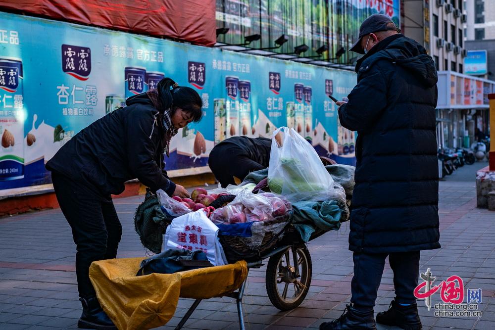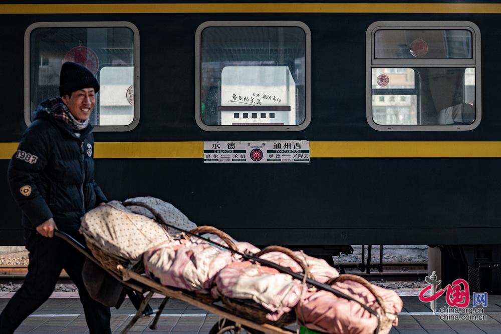 到達(dá)承德站后,“大筐隊”推著貨物出站準(zhǔn)備售賣。中國網(wǎng)記者 鄭亮攝