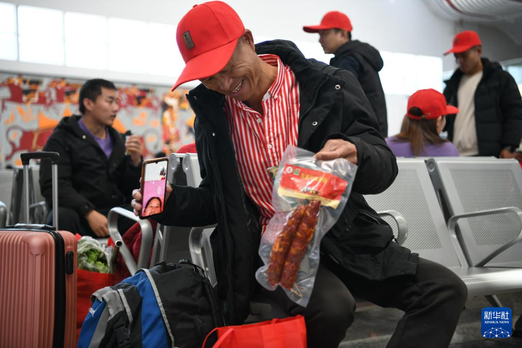 2月11日,在西昌西站,來自涼山州寧南縣的楊碧富與家人視頻連線,展示愛心禮包中的食品。