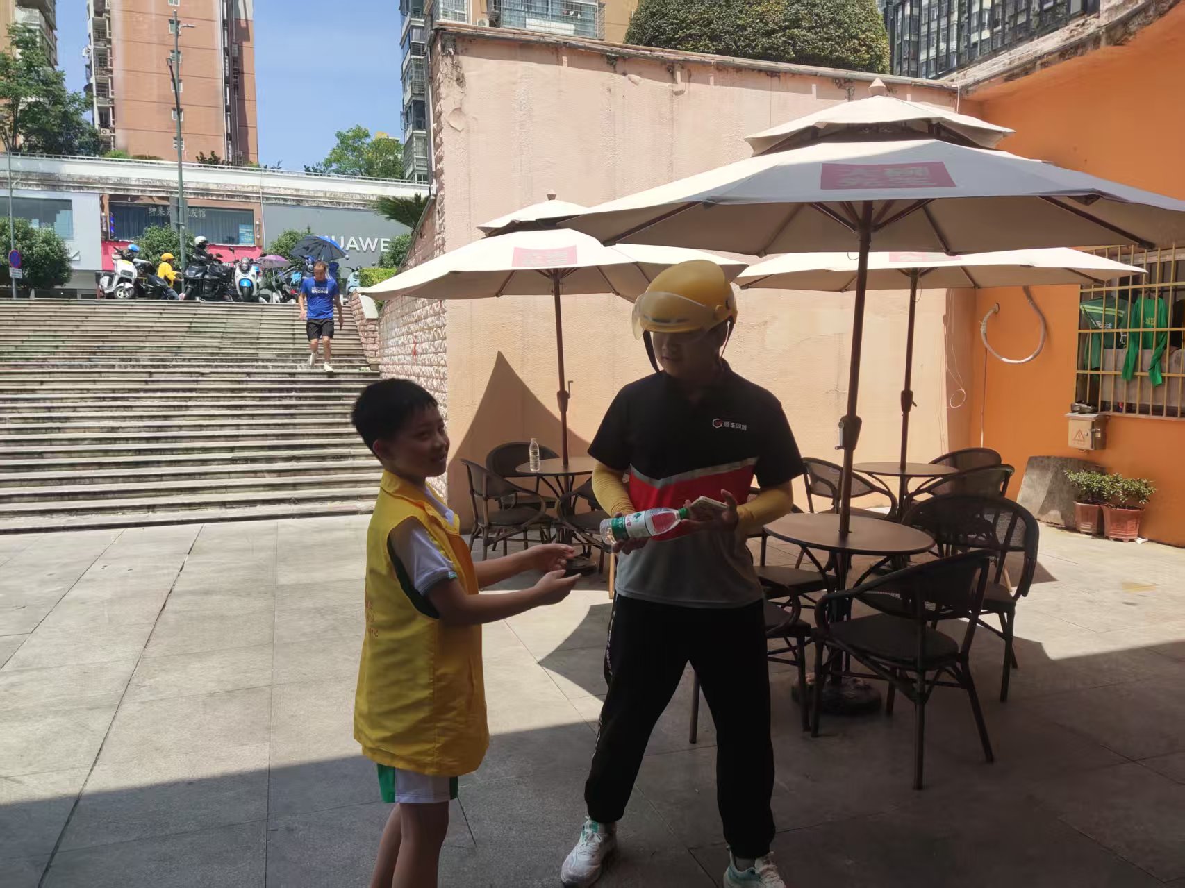 學生們青春的身影活躍于熱浪之中,尋訪著烈日下堅守的身影:環(huán)衛(wèi)工人汗?jié)褚陆髤s依然緊握掃帚;快遞小哥在蒸騰的熱氣中爭分奪秒奔忙;建筑工人黝黑的面龐上汗珠滾落……當學生們將承載敬意的清涼之水遞上,環(huán)衛(wèi)師傅王大姐一面擦拭汗水,一面動情地說:“這水甜到心里去了!孩子們真好!”一位快遞小哥也禁不住感慨:“這么熱的天,孩子們真有心,謝謝你們!”