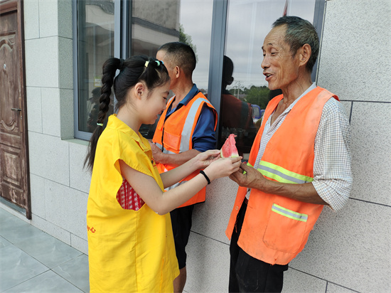 “叔叔阿姨,你們是最美的環(huán)境美容師,辛苦了!請(qǐng)吃西瓜!”小小義工們簡(jiǎn)單的話語(yǔ)讓環(huán)衛(wèi)師傅們倍感溫暖。在田漢社區(qū),50歲環(huán)衛(wèi)師傅楊檢接過(guò)切好的西瓜和防暑物資時(shí)連連道謝:“你們送過(guò)來(lái)的西瓜真好吃,這些物品還都很實(shí)用,我們心里頭也涼快多了!”