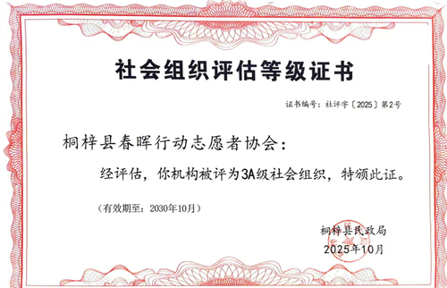 中國(guó)新報(bào)訊((特約記者 謝澤龍)近日,桐梓縣民政局為桐梓縣春暉行動(dòng)志愿者協(xié)會(huì)頒發(fā)匾牌,獲評(píng)遵義市桐梓縣社會(huì)組織評(píng)估AAA級(jí)社會(huì)組織。桐梓縣春暉行動(dòng)志愿者協(xié)會(huì)憑借規(guī)范的內(nèi)部管理、豐富的公益實(shí)踐和突出的社會(huì)貢獻(xiàn),經(jīng)過(guò)嚴(yán)格的評(píng)估審核,成功獲評(píng)桐梓縣 AAA 級(jí)社會(huì)組織,這是對(duì)協(xié)會(huì)多年來(lái)深耕志愿服務(wù)領(lǐng)域、踐行公益初心的高度認(rèn)可。