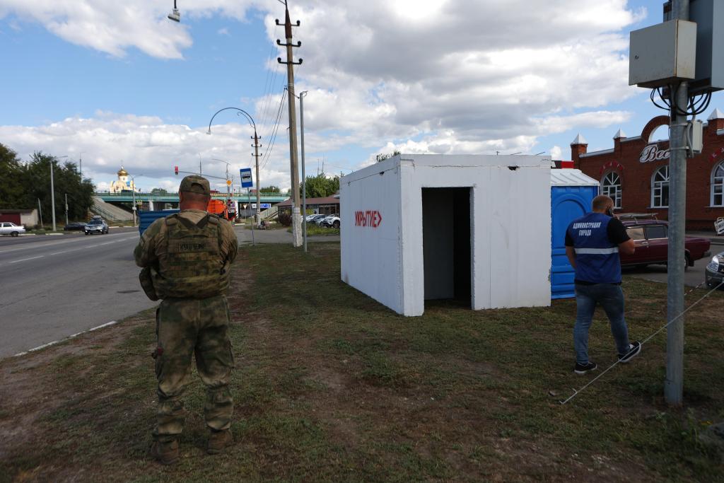2024年8月12日,在俄烏邊境俄方一側(cè)別爾哥羅德州首府別爾哥羅德市,軍人在臨時掩體旁執(zhí)勤。新華社發(fā)