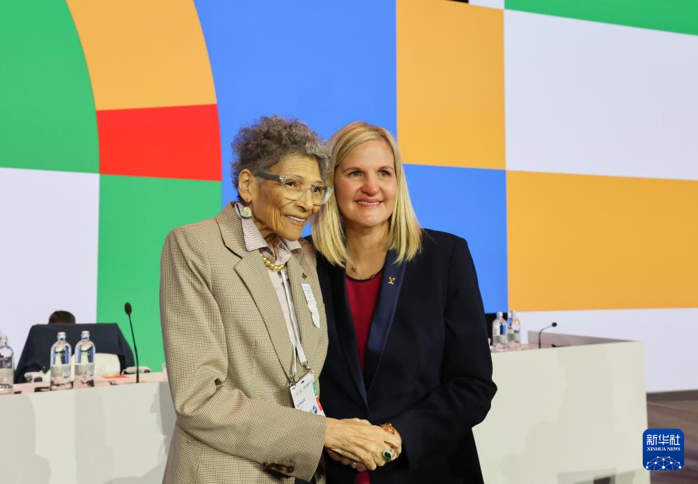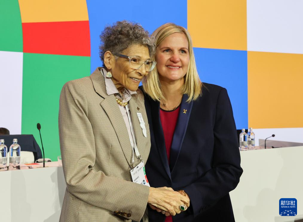 3月20日,國(guó)際奧委會(huì)新一任主席考文垂(右)和國(guó)際奧委會(huì)副主席小薩馬蘭奇擁抱。