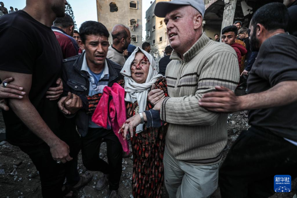 4月17日,在加沙地帶北部杰巴利耶難民營,人們幫助傷者。