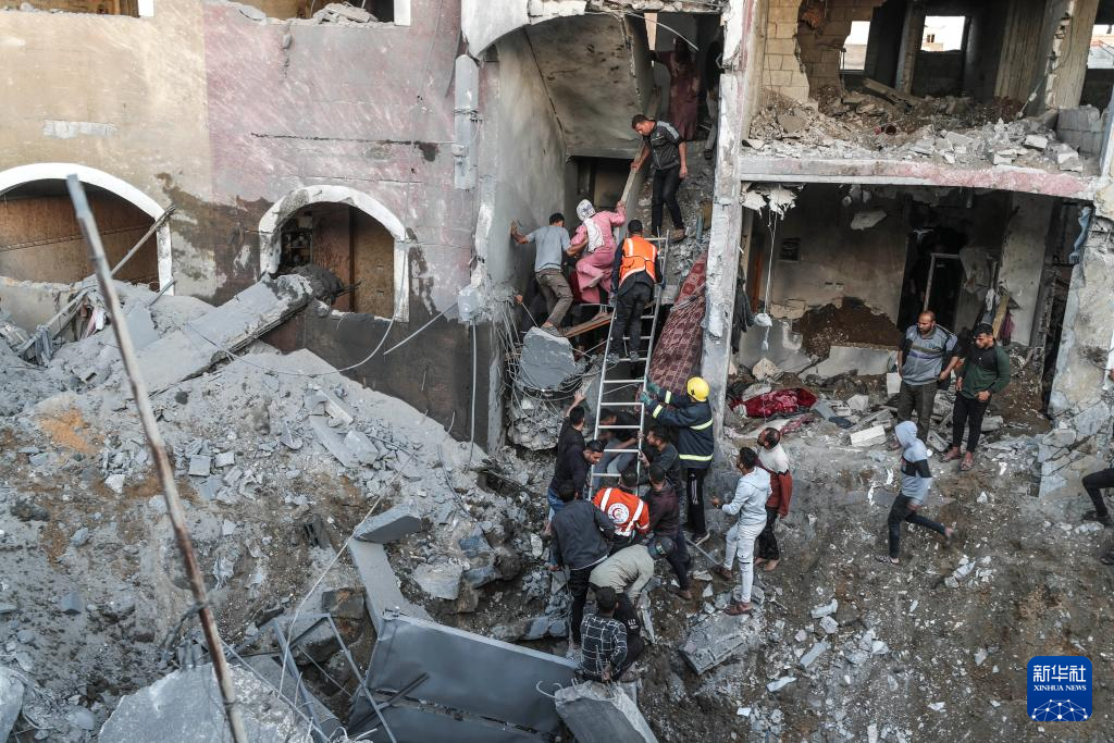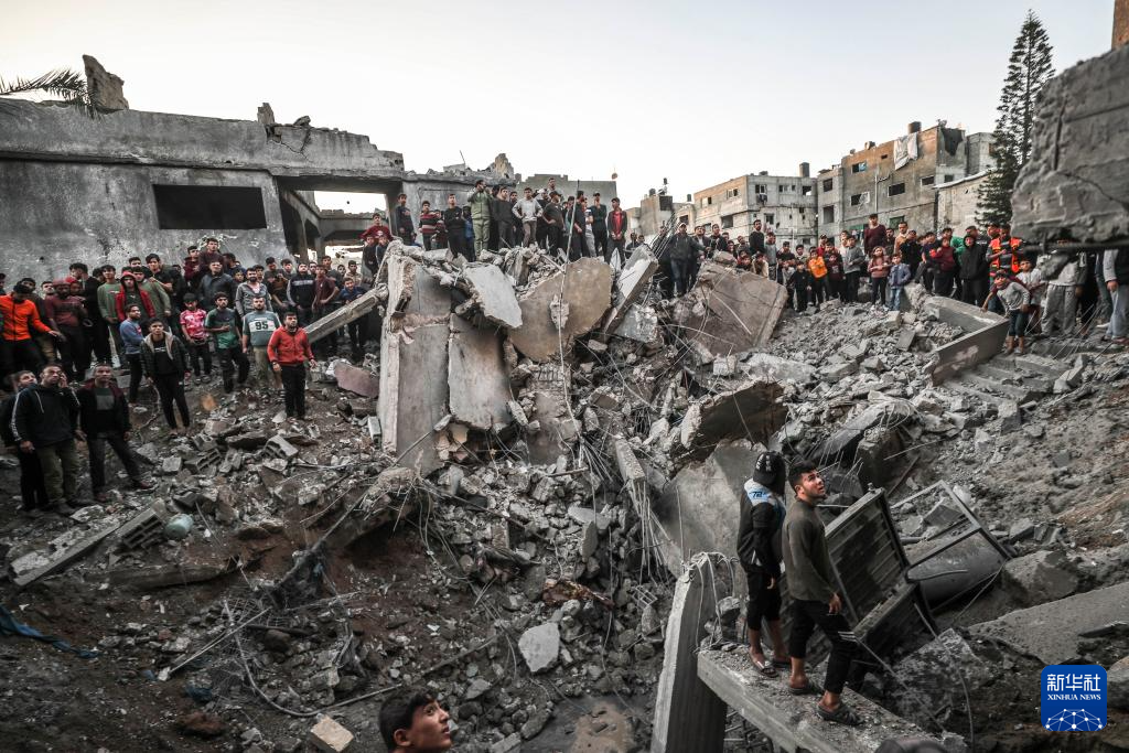4月17日,在加沙地帶北部杰巴利耶難民營,人們查看以軍襲擊后的廢墟。