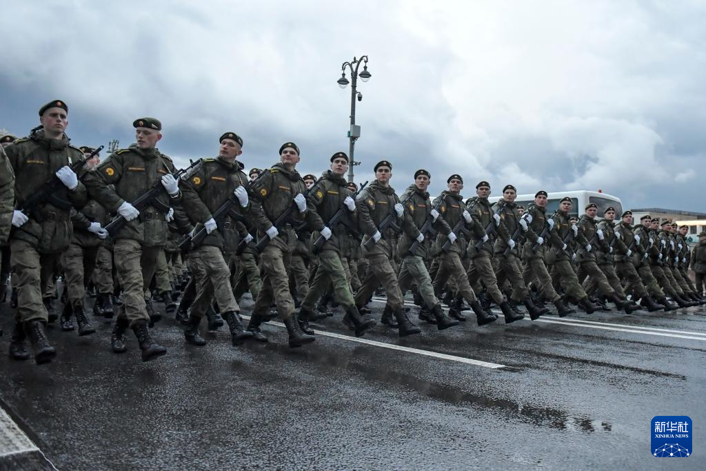 4月29日,在俄羅斯首都莫斯科,參加閱兵式彩排的士兵列隊(duì)行進(jìn)。