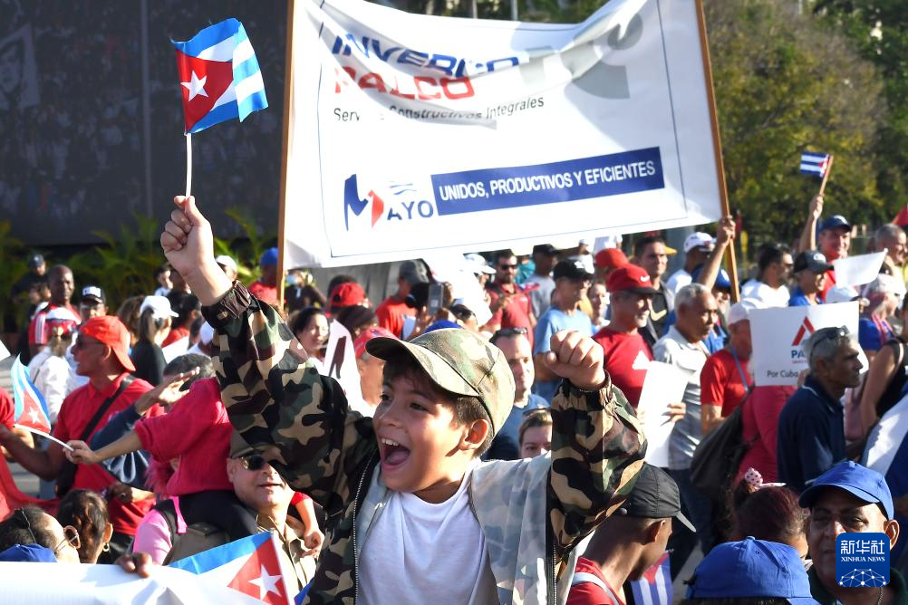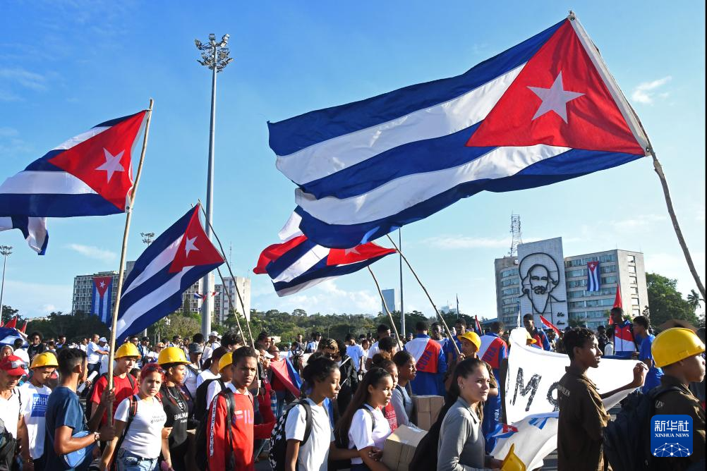 5月1日,在古巴首都哈瓦那革命廣場,人們手持國旗和橫幅參加“五一”國際勞動節(jié)集會游行。