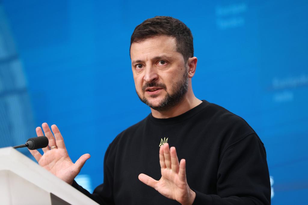 2024年10月17日,在比利時(shí)布魯塞爾,烏克蘭總統(tǒng)澤連斯基在歐盟峰會上參加新聞發(fā)布會。新華社記者趙丁喆攝
