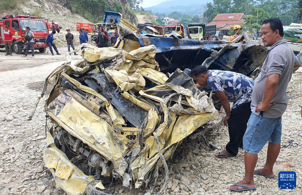 5月31日,在印度尼西亞西爪哇省井里汶,人們在事發(fā)采石場附近查看受損車輛。