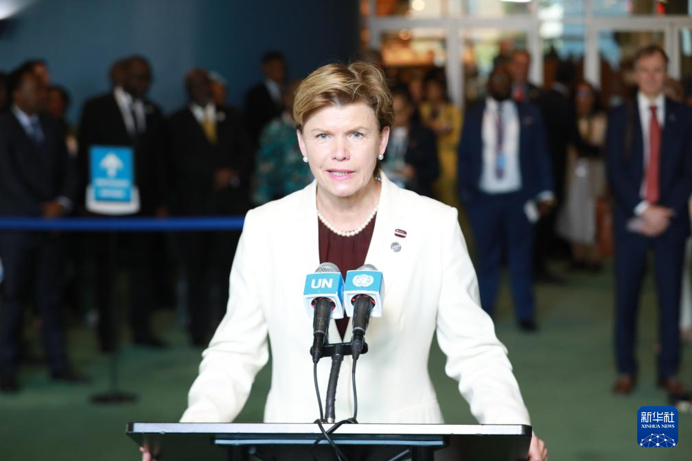 6月3日,在位于紐約的聯(lián)合國(guó)總部,拉脫維亞外長(zhǎng)拜芭·布拉澤在拉脫維亞當(dāng)選聯(lián)合國(guó)安理會(huì)非常任理事國(guó)后講話。