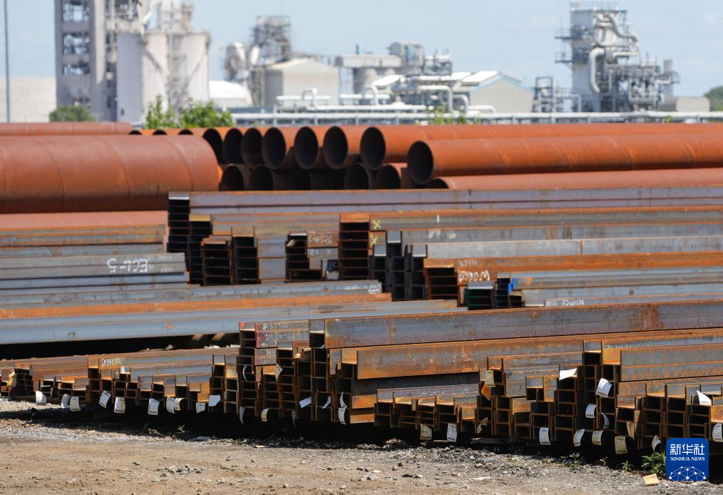 這是6月3日在加拿大不列顛哥倫比亞省德?tīng)査惶庝摬膹S拍攝的鋼管和鋼梁。
