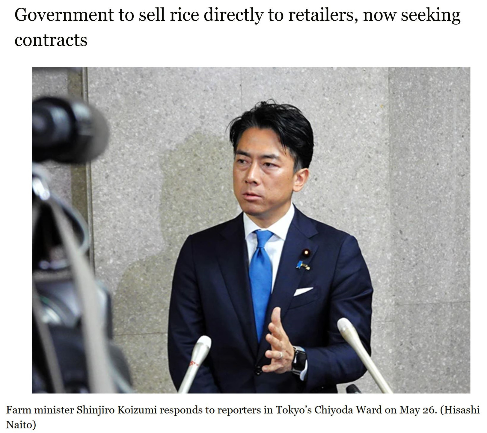 據(jù)悉,日本農協(xié)通過競標機制收購90%至95%的政府儲備米,并由此進行實質性壟斷,以便主導米價。正因如此,日本農林水產(chǎn)大臣小泉進次郎5月下旬表示,政府計劃直接將儲備米賣給零售商,而不是像之前那樣拍賣給中間商。