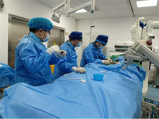腦病科主任黃暉得知情況后,立刻聯(lián)系永州市中心醫(yī)院南院派駐專家周鵬副主任醫(yī)師,共同組織病例討論,擬定手術(shù)方案。經(jīng)分析,當(dāng)前最緊迫的任務(wù)是盡快打通堵塞血管,而介入治療中的機(jī)械取栓是最有效的辦法。黃主任向患者家屬詳細(xì)說明病情及治療方案后,家屬充分理解并積極同意取栓治療。
