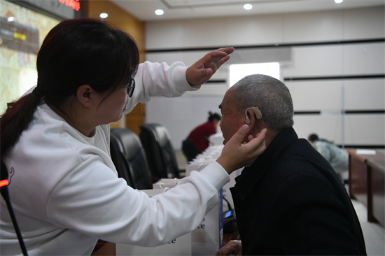 2025年3月3日,在貴州省凱里市的黔東南州殘聯(lián)第二十六個(gè)全國(guó)愛耳日宣傳教育活動(dòng)捐贈(zèng)現(xiàn)場(chǎng),專家給聽障人士調(diào)整助聽器。(楊仁海 攝)
