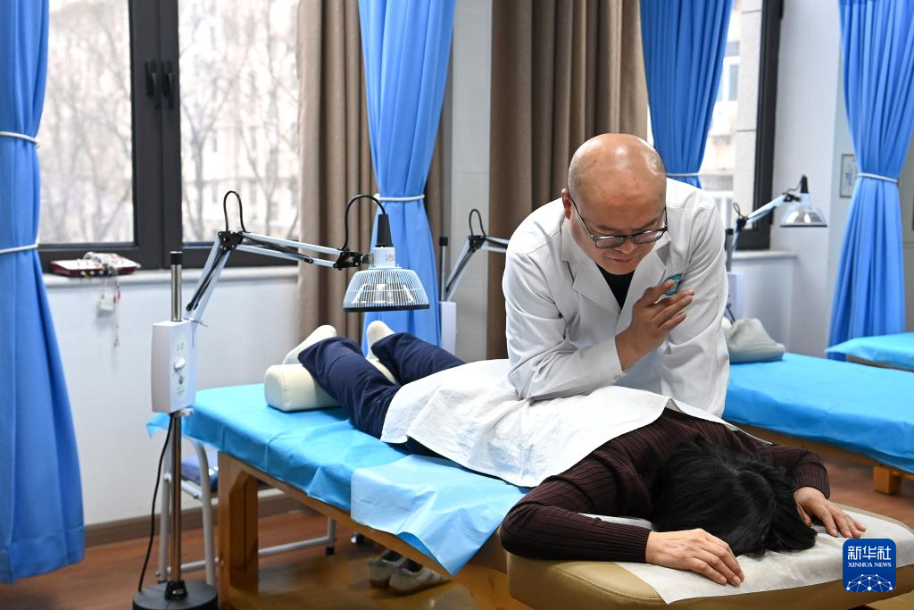 3月7日,雁塔區(qū)電子城二〇五所社區(qū)衛(wèi)生服務(wù)站中醫(yī)館的醫(yī)生對患者進行推拿按摩。