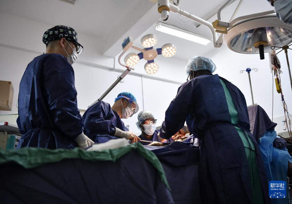 4月29日,在位于幾內(nèi)亞首都科納克里的中幾友好醫(yī)院,中方醫(yī)生與當(dāng)?shù)蒯t(yī)生為患者做手術(shù)。