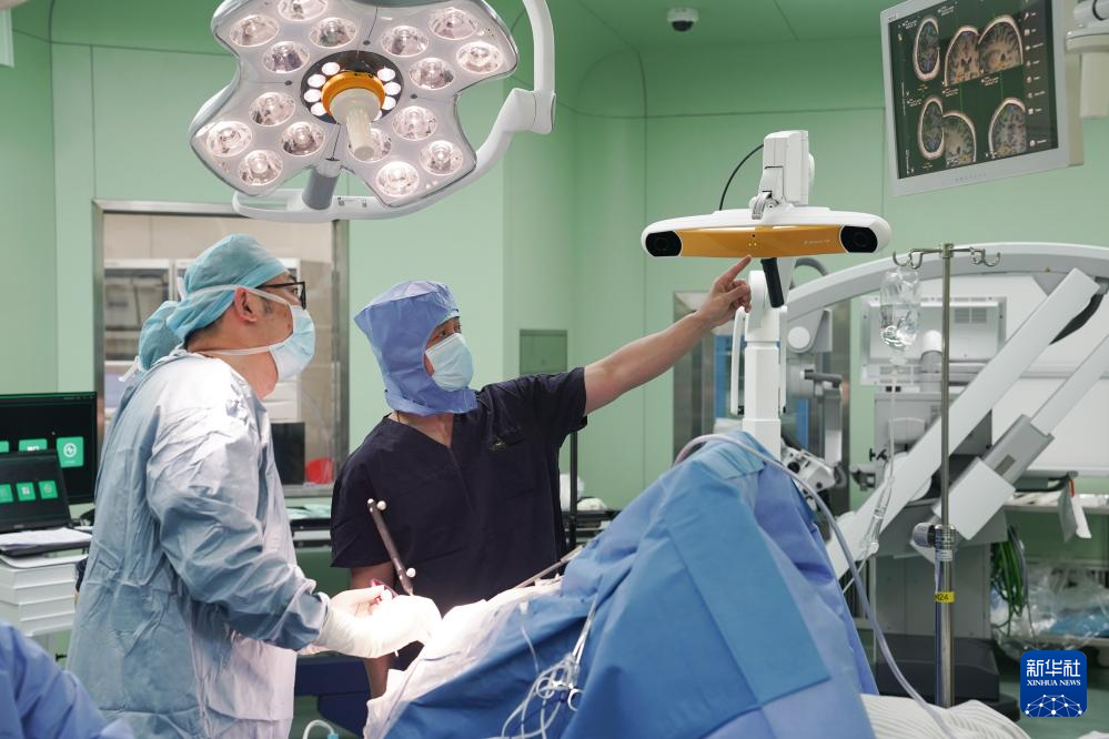 3月25日,在復旦大學附屬華山醫(yī)院手術室,路俊鋒教授(左)和吳勁松教授在給第一例臨床試驗受試者做手術。