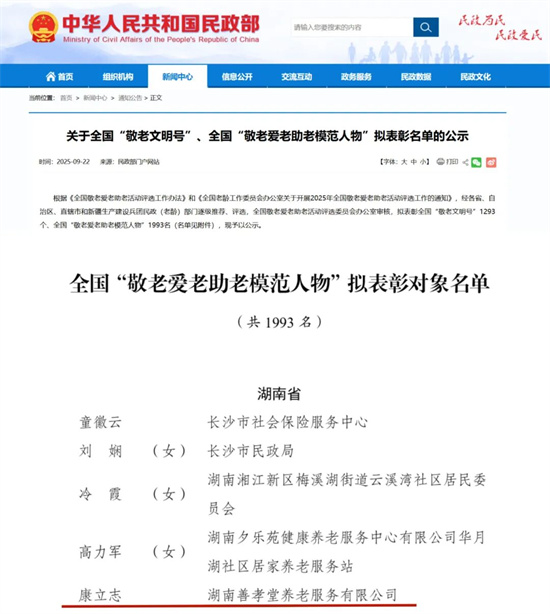 近日,2025 年全國 “敬老愛老助老模范人物” 評選結(jié)果正式公布,善孝堂2.0魚藝福養(yǎng)老董事長康立志憑借在養(yǎng)老服務(wù)領(lǐng)域的深耕實踐與突出貢獻(xiàn),榮獲2025年全國 “敬老愛老助老模范人物” 稱號。此項榮譽是對其踐行敬老初心、履行社會責(zé)任的高度認(rèn)可,更是對魚藝福養(yǎng)老深耕養(yǎng)老事業(yè)、守護(hù)老年群體幸福的肯定。