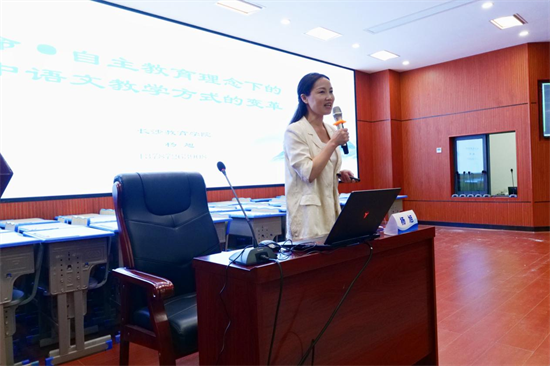 長沙縣一中圣和學(xué)校副校長陳曉以評課議課為基點,在講座《從學(xué)科拼盤到生命共鳴:語文多學(xué)科深度融合策略》中為參訓(xùn)教師解鎖跨學(xué)科教學(xué)的“破壁密碼”。