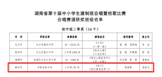 近日,由湖南省教育廳主辦的建制班合唱比賽中,衡陽市華新實(shí)驗(yàn)中學(xué)初一年級187班建制班合唱團(tuán)憑借《家鄉(xiāng)》《我夢都是追夢人》兩首作品的精彩演繹,從全省14個(gè)市州400余支參賽隊(duì)伍中脫穎而出,以飽滿的精神風(fēng)貌、專業(yè)的合唱技巧和默契的團(tuán)隊(duì)配合贏得評委高度贊譽(yù),最終斬獲湖南省級二等獎殊榮。這是該校在美育領(lǐng)域取得的又一鞏固性成果。