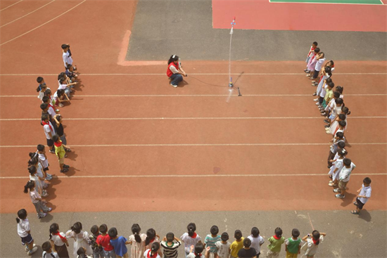 教室外,同學(xué)們齊聚運(yùn)動場、圍繞成圈,在志愿者組織下共同開展“水火箭”科普實(shí)驗(yàn)。志愿者拆解實(shí)驗(yàn)裝置,為同學(xué)們具體講解“水火箭”組成部件及對應(yīng)功能。現(xiàn)場同學(xué)們熱情高漲、熱烈互動,積極參與到“水火箭”的注水、加壓、發(fā)射環(huán)節(jié),共同見證“火箭”升空騰飛、徐徐降落。“通過親自操作‘水火箭’,我認(rèn)識到了科學(xué)研究的不易和科研精神之美,我將加強(qiáng)學(xué)習(xí)、提升知識素養(yǎng),努力成為知識扎實(shí)、本領(lǐng)過硬的新時代好少年”現(xiàn)場學(xué)生說。