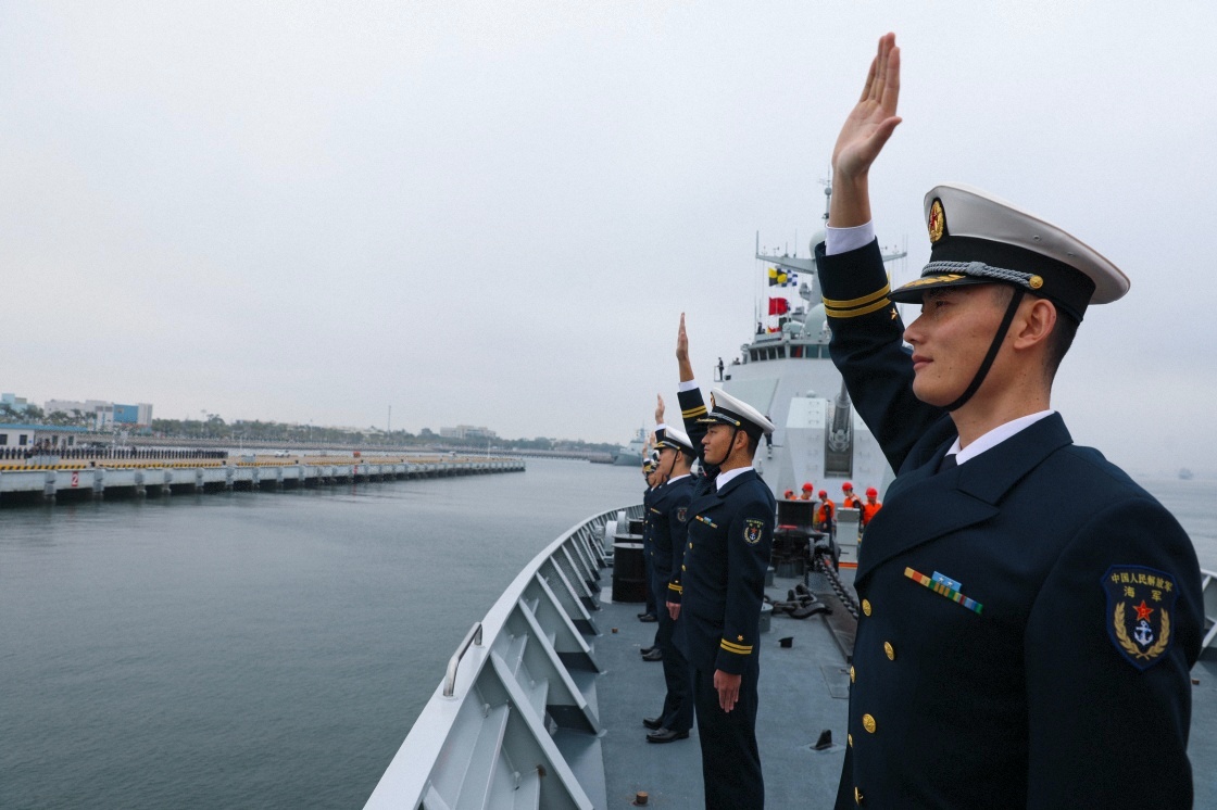 中國(guó)海軍第46批護(hù)航編隊(duì)返回廣東湛江某軍港,官兵們向碼頭歡迎人群揮手致意(2025年1月24日攝)。新華社發(fā)(陳元增 攝)