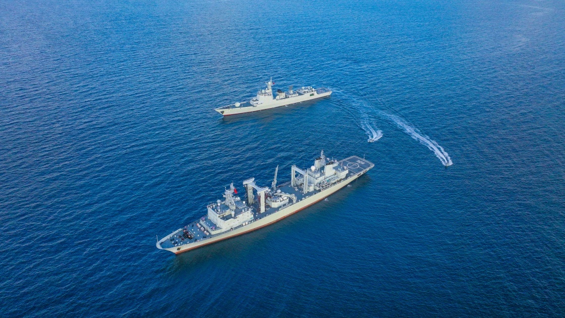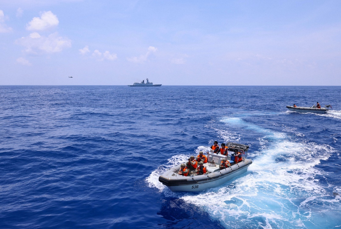 中國(guó)海軍第46批護(hù)航編隊(duì)組織反恐反海盜演練,艦艇掩護(hù)小艇出擊(2025年1月2日攝)。新華社發(fā)(張大禹 攝)