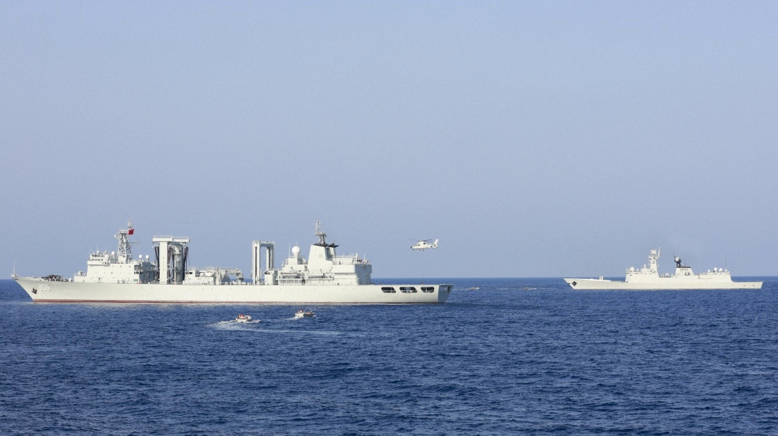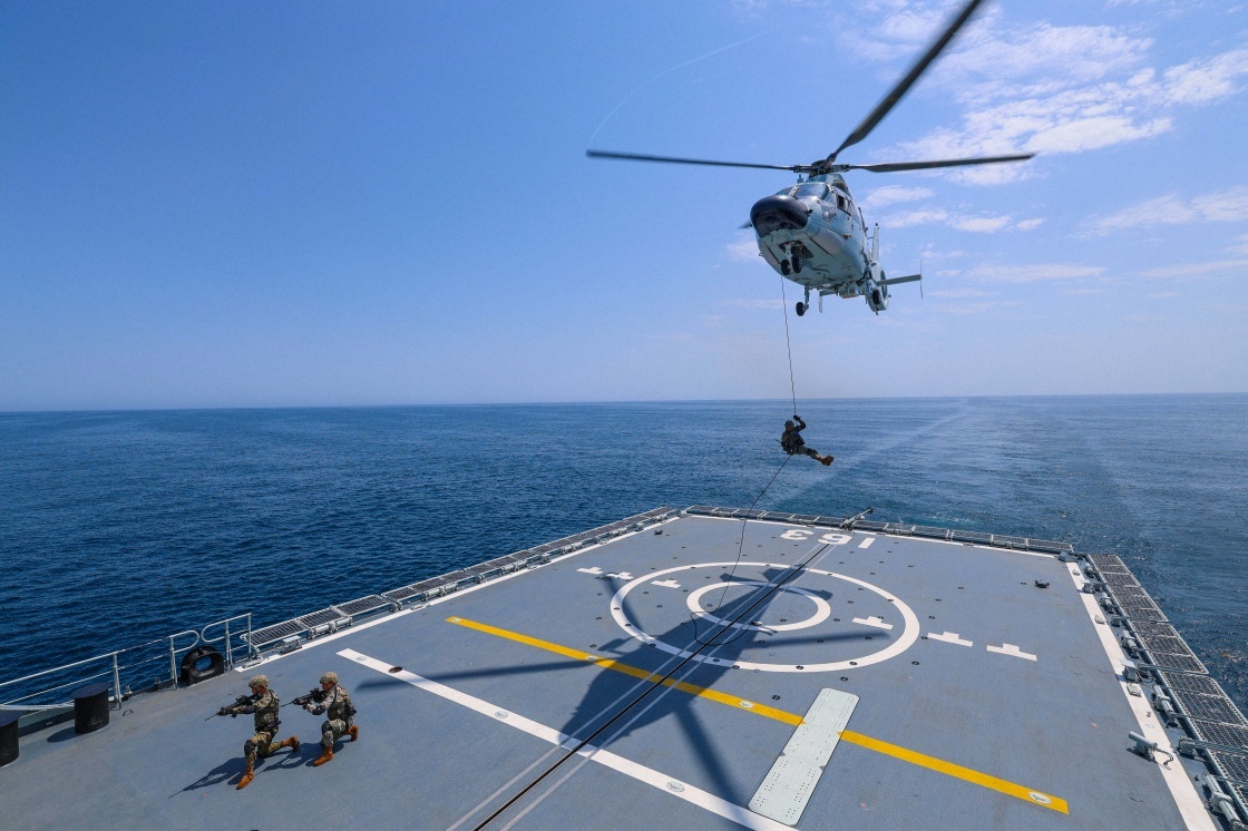 中國(guó)海軍第46批護(hù)航編隊(duì)組織反恐反海盜演練,艦、艇、機(jī)立體出動(dòng)(2024年4月19日攝)。新華社發(fā)(梁磊 攝)