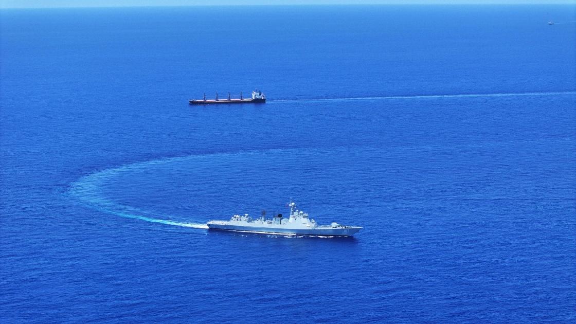 中國(guó)海軍第46批護(hù)航編隊(duì)焦作艦(下)護(hù)送貨船至解護(hù)點(diǎn)后與之分航(2024年5月7日攝)。新華社發(fā)(張大禹 攝)