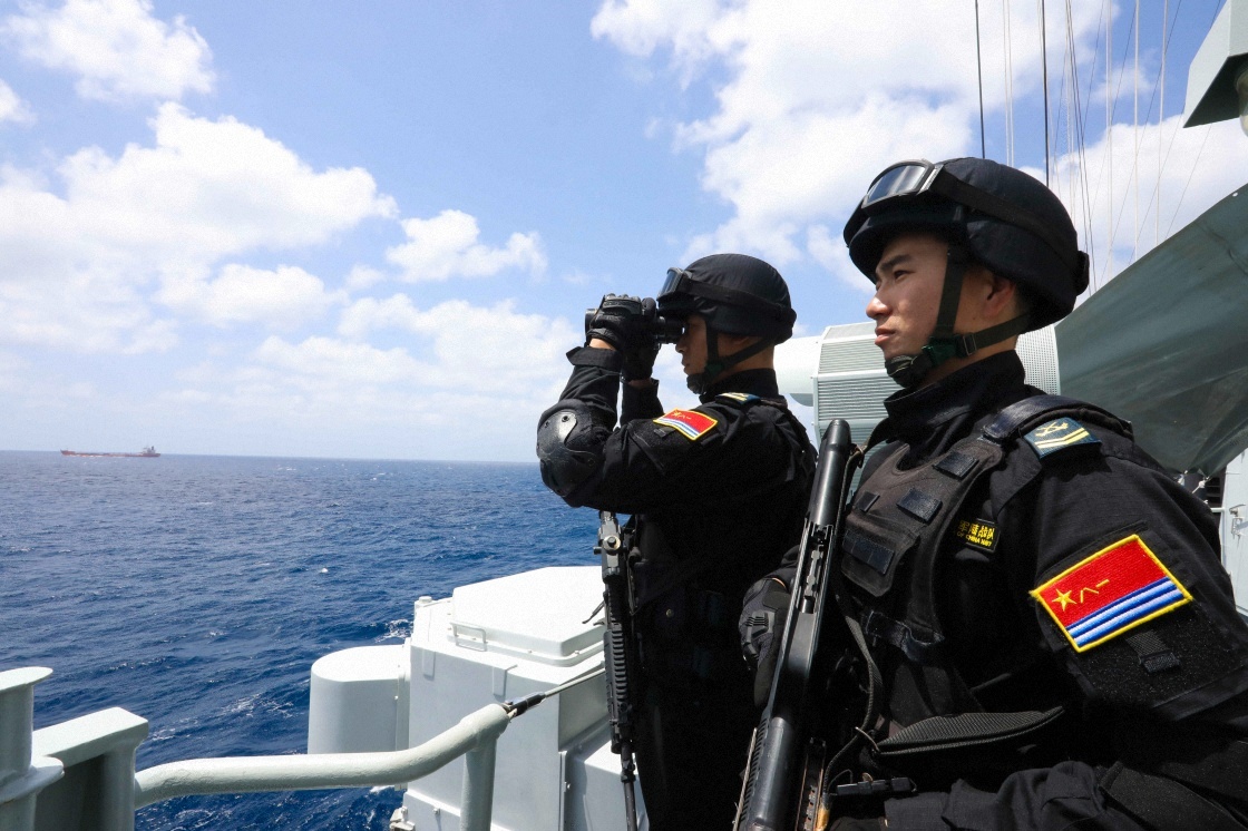中國(guó)海軍第46批護(hù)航編隊(duì)隨艦特戰(zhàn)隊(duì)員執(zhí)勤警戒(2024年3月18日攝)。新華社發(fā)(梁磊 攝)