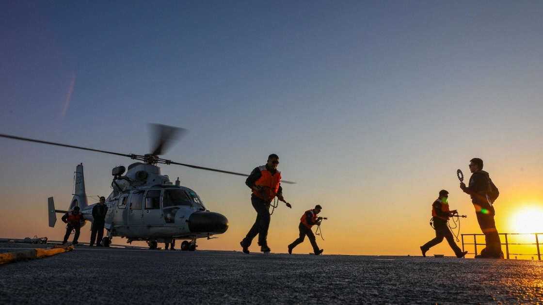 中國(guó)海軍第46批護(hù)航編隊(duì)組織艦載直升機(jī)跨晝夜飛行訓(xùn)練(2024年8月13日攝)。新華社發(fā)(張大禹 攝)