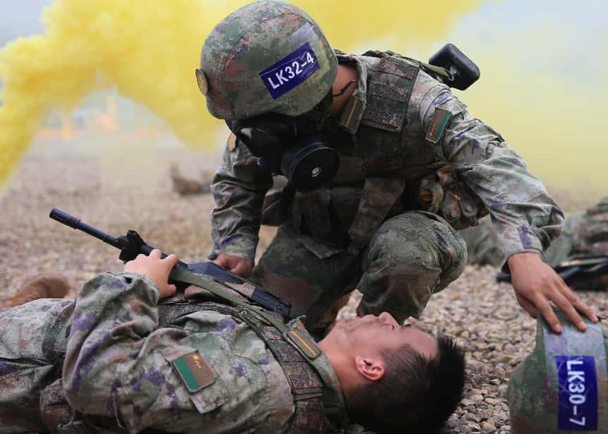 “衛(wèi)生員,這里有‘傷員’!”演練場上,一名佩戴紅十字袖標(biāo)、全副武裝的學(xué)員快速躍進(jìn),為“頭部受傷”的戰(zhàn)友進(jìn)行包扎,一旁“腿部中彈”的“傷員”依托掩體展開自救……