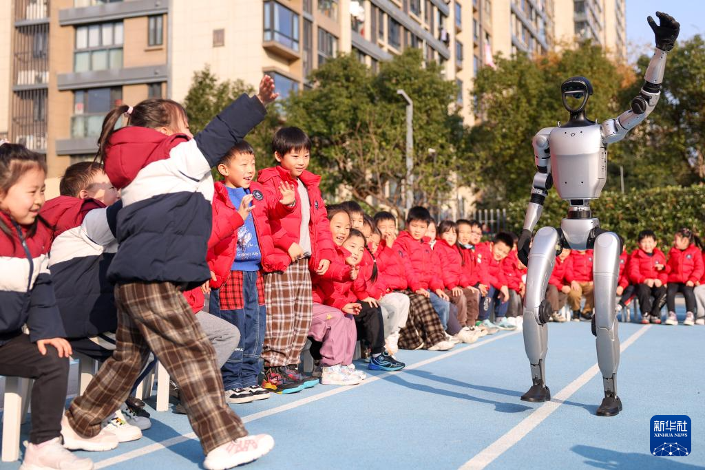 1月2日,寧波市江北區(qū)甬港幼兒園的孩子們在科普活動現(xiàn)場與機器人互動。