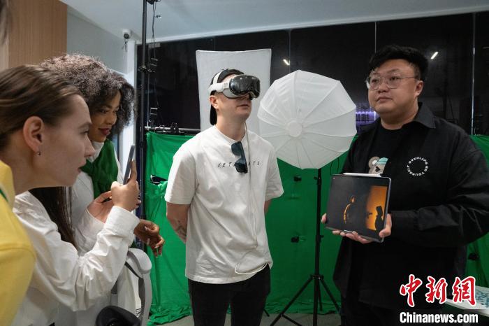 5月10日,來自俄羅斯的主播伏拉夫使用VR眼鏡觀看敦煌壁畫。中新社記者 吳君毅