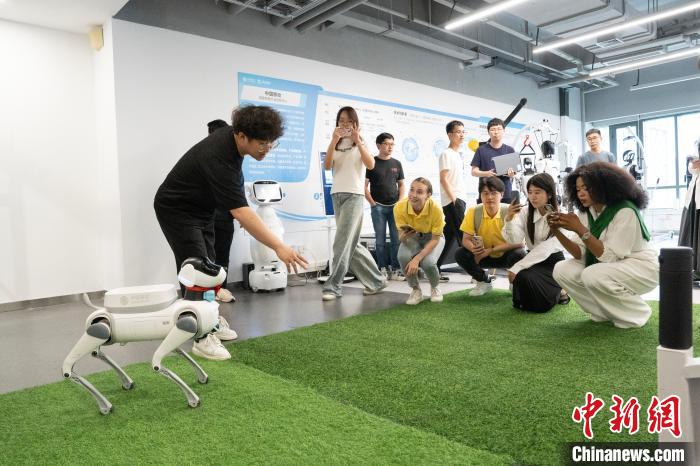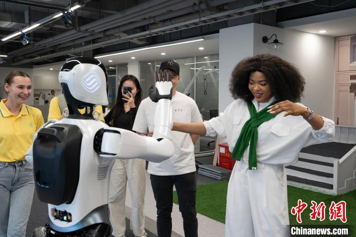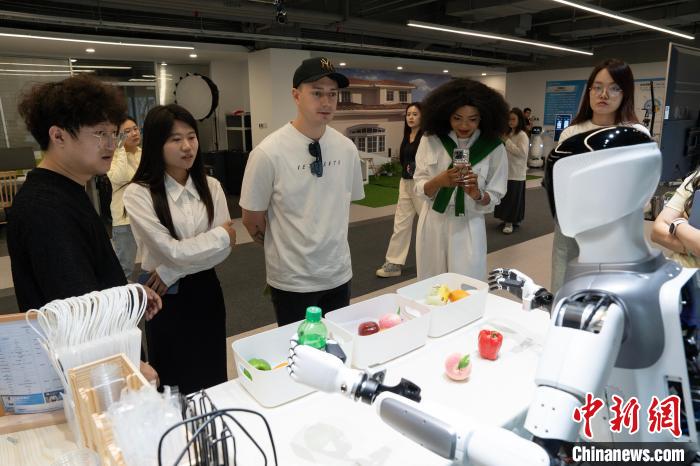 5月10日,中外青年了解陪伴型機(jī)器人功能。中新社記者 吳君毅