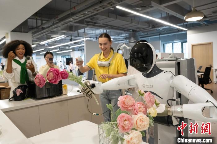 5月10日,烏茲別克斯坦留學(xué)生蘭娜使用機(jī)器人插花。中新社記者 吳君毅