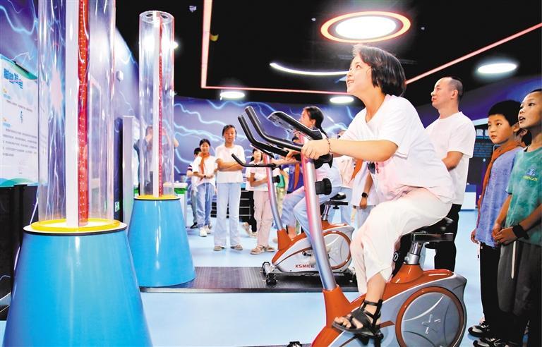 5月27日,湖北省十堰市鄖陽(yáng)區(qū)科技館,“腳踏發(fā)電”裝置吸引游客體驗(yàn)。