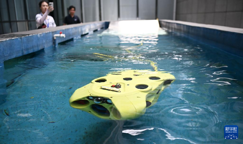 6月24日,在東莞的廣東省智能機器人研究院,廣東藍潛海洋技術(shù)有限公司工作人員對智能水下機器人進行測試。