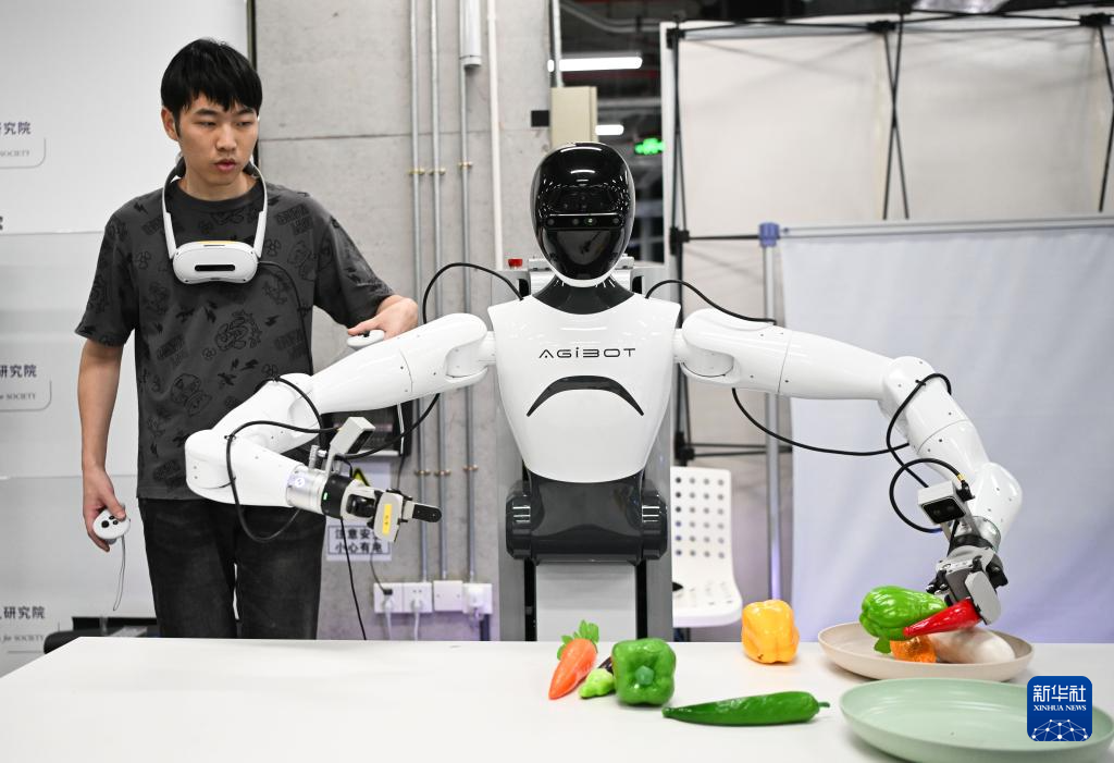 6月25日,工作人員在廣東省具身智能機器人創(chuàng)新中心操控機器人抓取物品。
