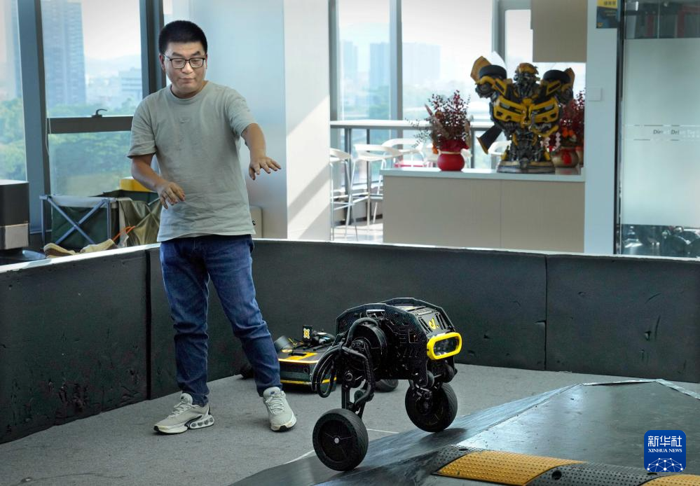 6月23日,在廣東東莞松山湖XbotPark機器人基地,本末科技工作人員操作機器人爬樓梯。