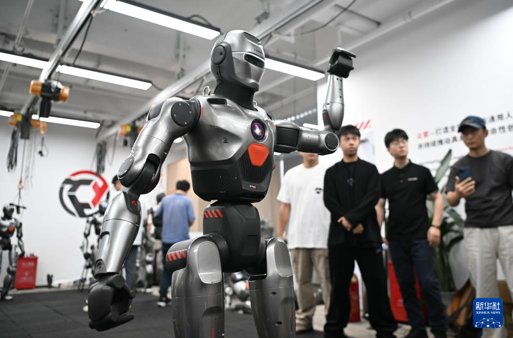 6月25日,在深圳市眾擎機器人科技有限公司,人形機器人揮舞手臂致意。