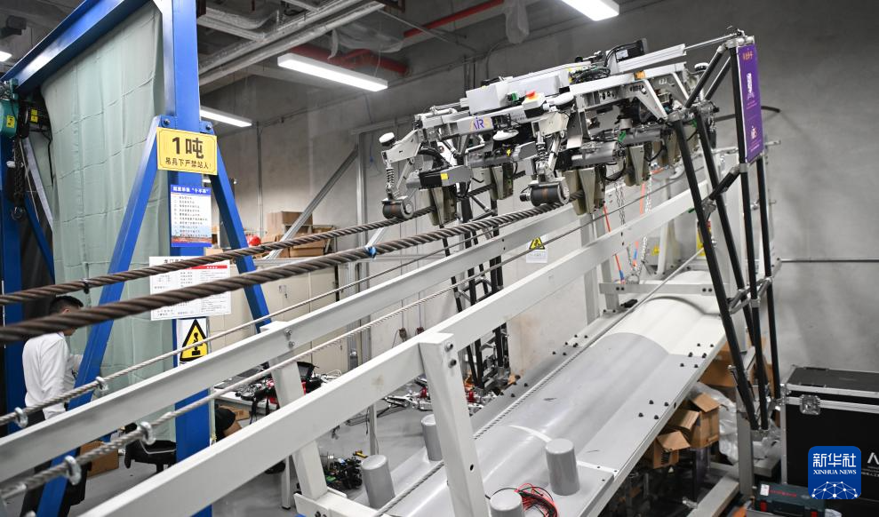這是6月25日在深圳的廣東省具身智能機器人創(chuàng)新中心拍攝的懸索橋主纜檢修機器人。
