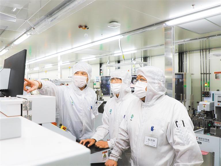 7月21日,位于金山區(qū)的瑞能微恩半導(dǎo)體(上海)有限公司,技術(shù)人員正在討論芯片貼裝工藝優(yōu)化及工時調(diào)整方案。