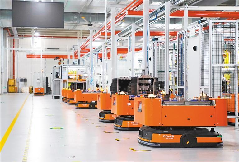 7月21日,位于金山區(qū)的特百佳動力科技股份有限公司芯工廠內(nèi),AGV自動搬運車排列整齊。該公司自動變速箱產(chǎn)線全線采用AGV無人化運輸。