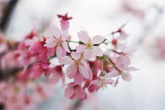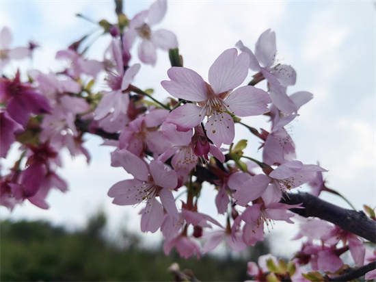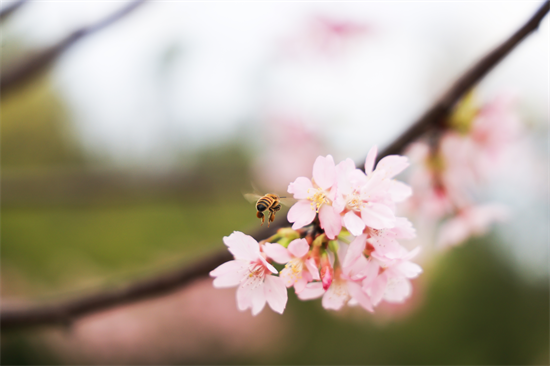 綻放的櫻花引來蜜蜂翩翩舞動(dòng),宛如一幅美麗的畫卷。(周冬梅 攝)