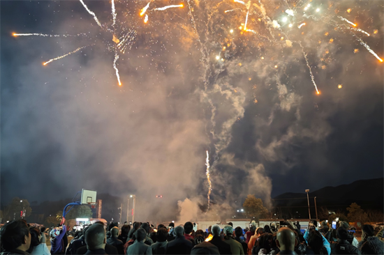 華燈初上,一場篝火晚會在華山村文體廣場拉開帷幕,少數(shù)民族舞蹈、湊數(shù)字游戲、煙花秀等主題活動精彩紛呈,主持人現(xiàn)場教授2個(gè)少數(shù)民族舞蹈讓游客0基礎(chǔ)更快更簡單的加入歡樂的氛圍中,眾多親子家庭踴躍報(bào)名參與,活動現(xiàn)場趣味橫生。最后,活動在一片璀璨的煙花秀中閉幕,上萬名游客現(xiàn)場盡享視覺盛宴,火樹銀花閃耀著華山村的夜空。