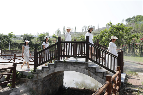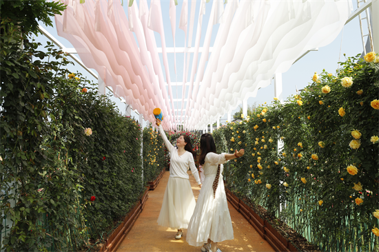 走進(jìn)玫瑰園,便仿佛置身于一個(gè)五彩斑斕的世界。深紅色、粉紅色、白色、黃色等不同顏色的花朵相互交織,有的熱烈綻放,有的花蕊初露,有的含苞待放,到處都是浪漫的氣息。筆者在現(xiàn)場看到,游客們紛紛漫步花叢中賞花拍照,錄視頻,享受快樂悠閑的時(shí)光,勾勒出一幅美麗的鄉(xiāng)村畫卷。