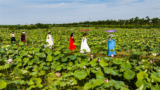 2025年6月24日,安徽省合肥市廬江縣石頭鎮(zhèn)大片盛開的太空蓮與村舍、道路、農(nóng)田交相互應(yīng),構(gòu)建出一幅夏日五彩斑斕的美麗鄉(xiāng)村新畫卷,吸引了許多游客前來打卡、拍照、走秀。