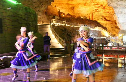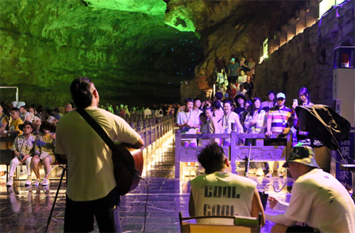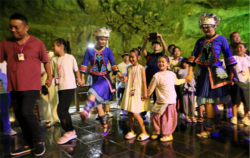 “洞內(nèi)涼爽如春,奇妙的光影、美妙的音樂(lè)與自然美景完美的融合在一起。”來(lái)自廣東的楊先生感嘆道:“在億萬(wàn)年的溶洞中聆聽(tīng)音樂(lè),觀看非遺表演,仿佛穿越時(shí)空與地球?qū)υ?,這種體驗(yàn)非常奇妙!”