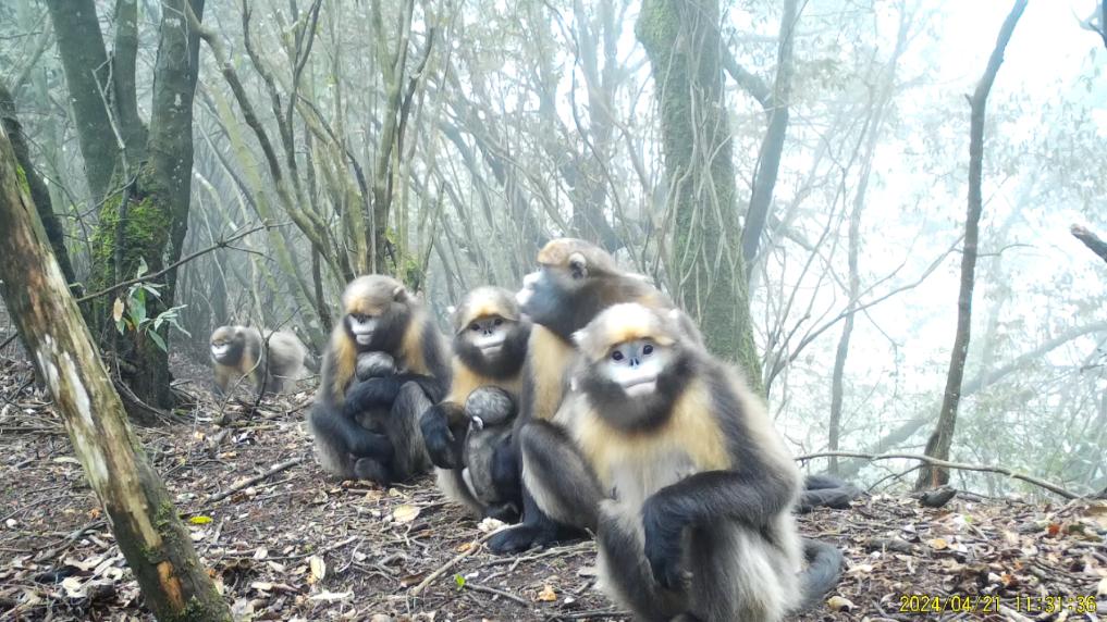 2024年4月,在貴州梵凈山,紅外相機監(jiān)測到的國家一級重點保護野生動物黔金絲猴的野外種群。(貴州省林業(yè)調(diào)查規(guī)劃院供圖)